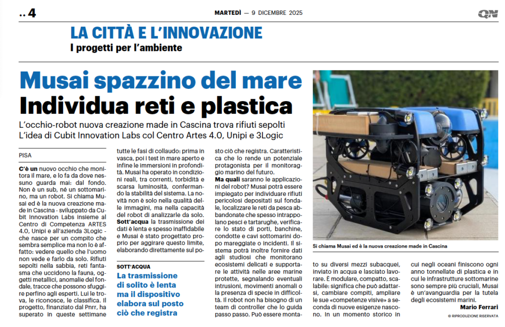 Il progetto MUSAI è stato recentemente oggetto di un articolo pubblicato su La Nazione – Cronaca di Pisa e Pontedera, che ha approfondito obiettivi, sviluppo e risultati raggiunti dal sistema subacqueo intelligente sviluppato da Cubit Innovation Labs, cogliendo l’impatto che potrà avere sul monitoraggio della plastica in mare e l’inquinamento.